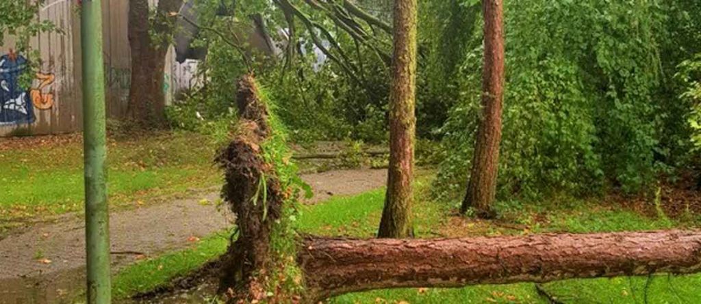 Die sofortige Erkundung des Einsatzleiters ergab, dass hinter dem Gebäude ein großer Teil der Dacheindeckung des Hallenbades herabgestürzt und mehrere Bäume umgefallen bzw. abgeknickt waren. Die Feuerwehr sperrte den Gefahrenbereich umgehend ab und führte die Besucher der Turnhalle und des Hallenbades nach draußen in einen sicheren Bereich.