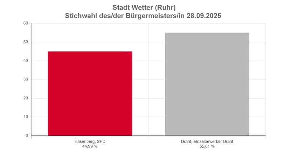 Bei der Stichwahl für das Amt des Bürgermeisters hat Hans-Günter Draht (parteilos) die erforderliche Mehrheit der Stimmen erreicht. Er lag mit 55,01% vor Frank Hasenberg von...